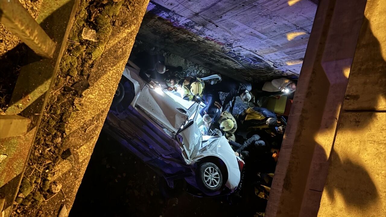Yaklaşık 10 metre yükseklikten düşen otomobilde sıkışan sürücü Eren B, itfaiye ekiplerince bulunduğu yerden çıkarıldı.
