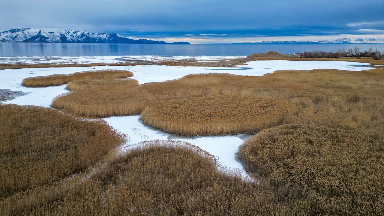 Yüzeyi buzla kaplanan sazlık, havadan görüntülendi.